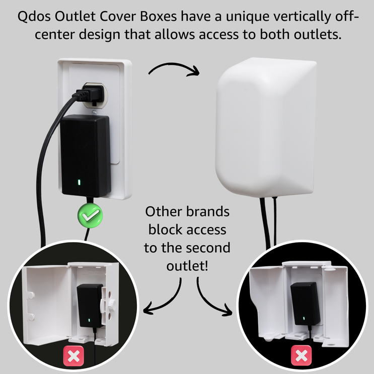 The Qdos® Safety Large Outlet Cover Box keeps your little ones safe while still letting you power bulky charging blocks and oversized adapters. With the largest interior of any outlet cover, it fits even the biggest chargers and allows you to use both outlets at the same time. By neatly hiding cords and adapters inside, it not only prevents access to dangerous outlets but also gives your home a cleaner, more organized look.